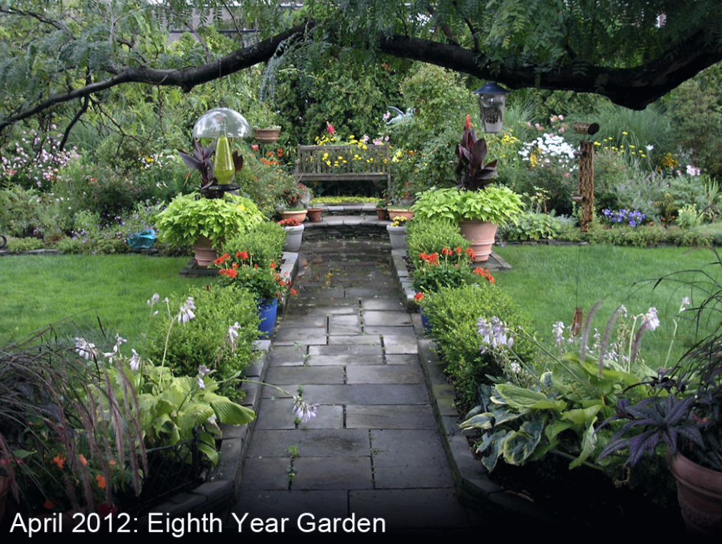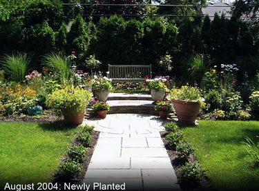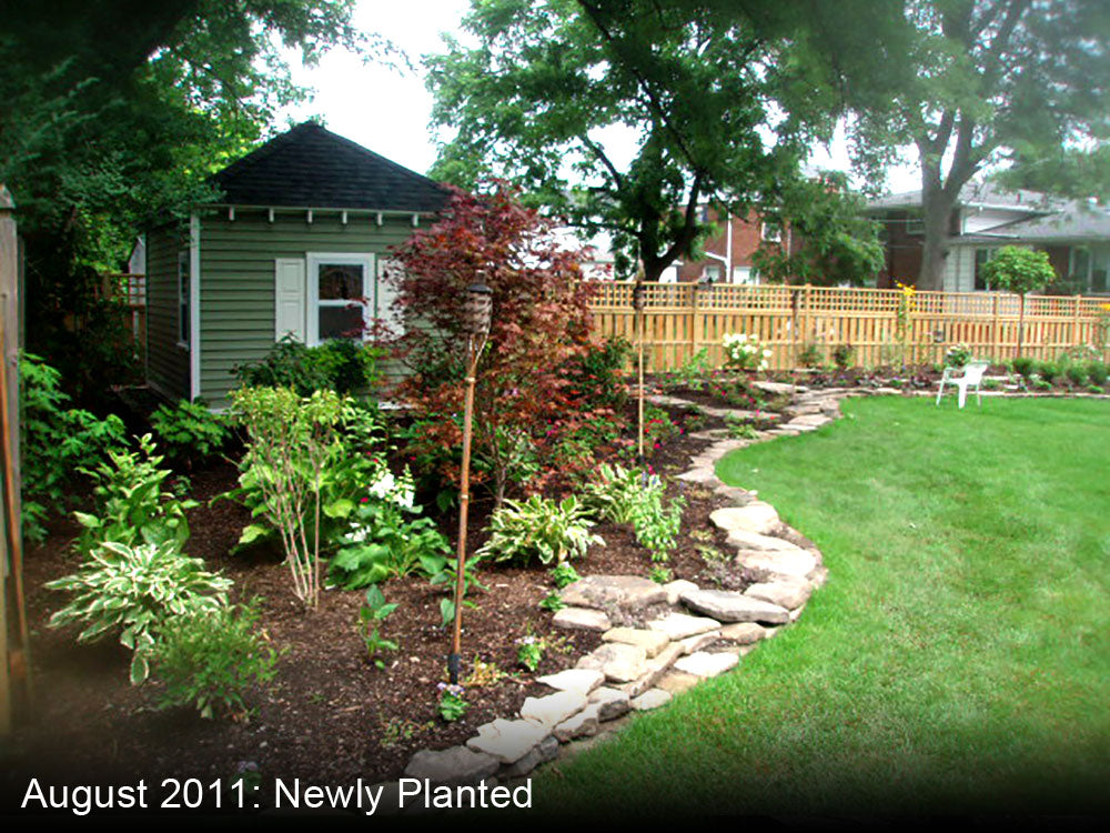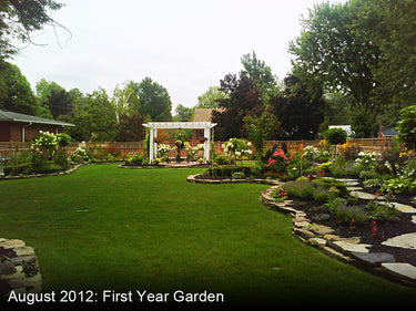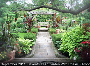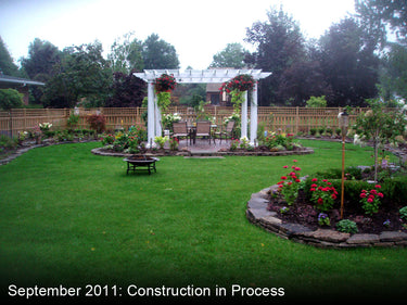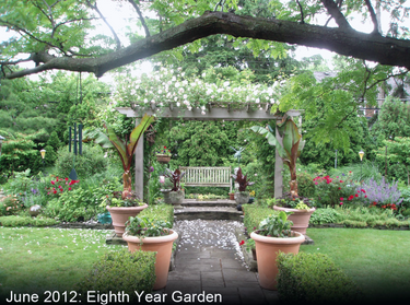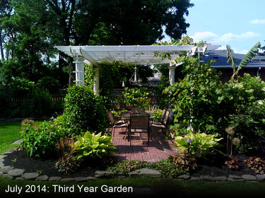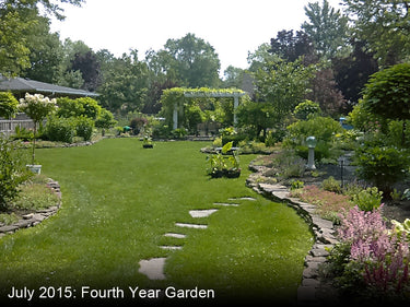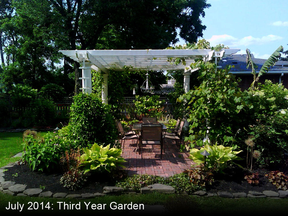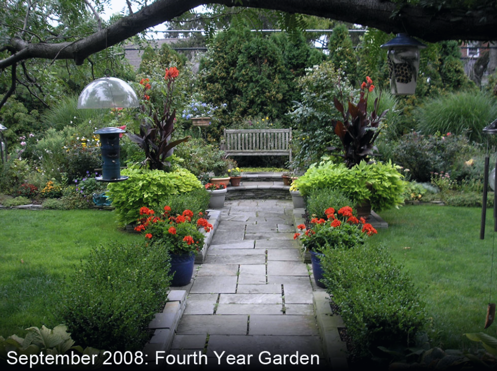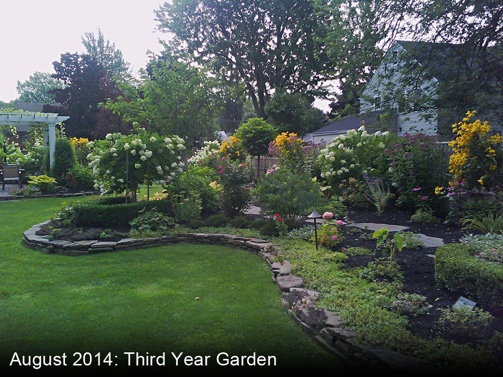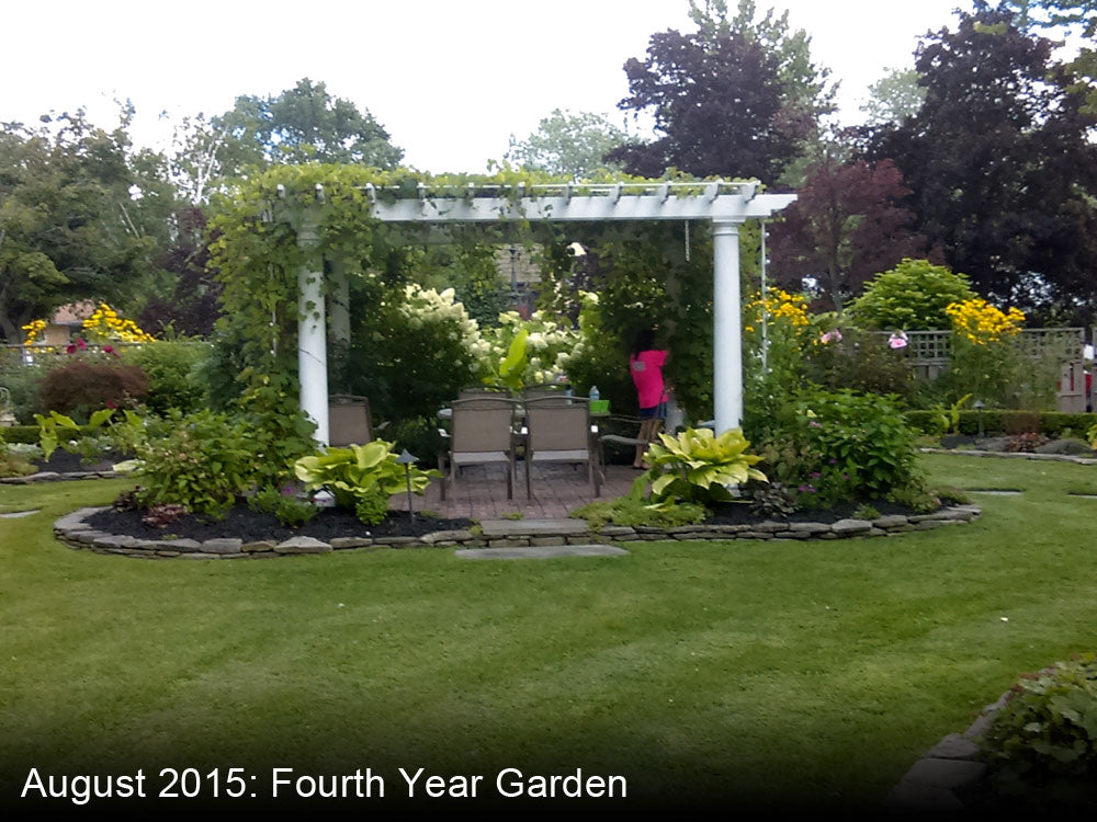 The garden design for this classic English garden began in 2004, with three major phases of construction: the first year saw the introduction of perennial flower beds and privacy plantings, in 2006 we added flagstone walkways and boxwoods, and in 2011 we installed a cedar arbor. The garden includes a sequence of blooms with creeping phlox, viburnum, clematis, and New Dawn rose, tropical red bananas, alocasia, and asters. In 2015 we added a lilac planting; this is a perennial favorite garden!