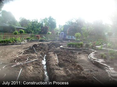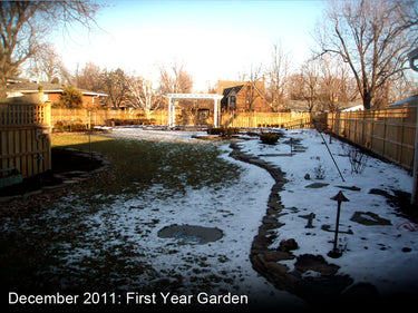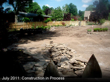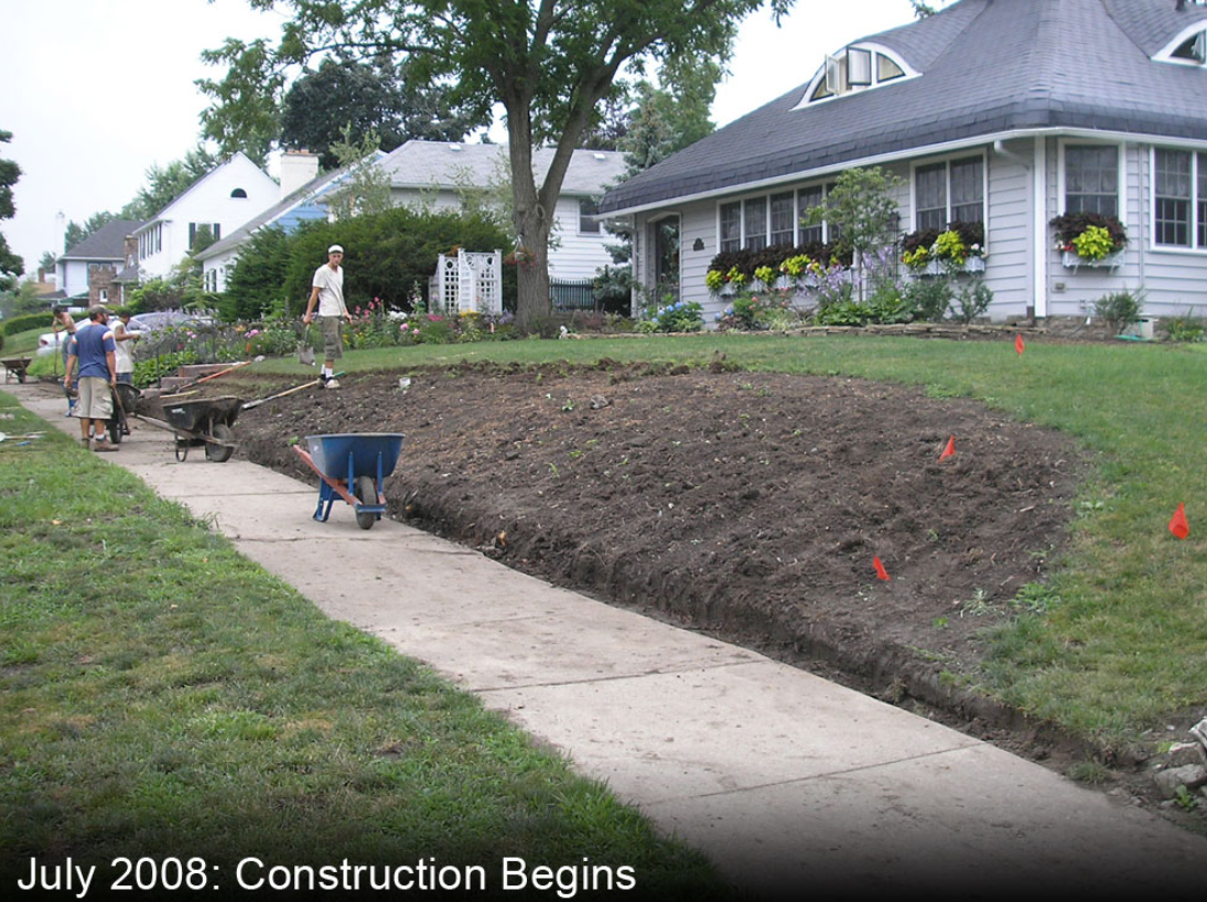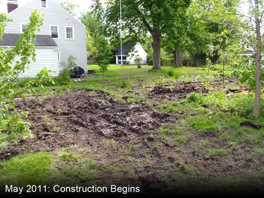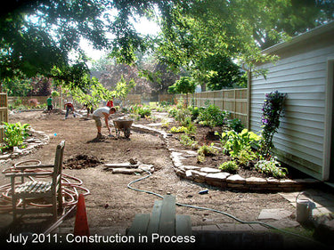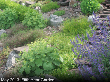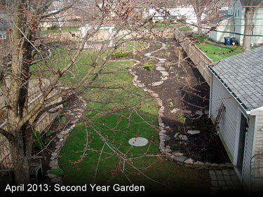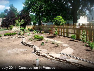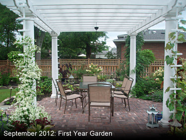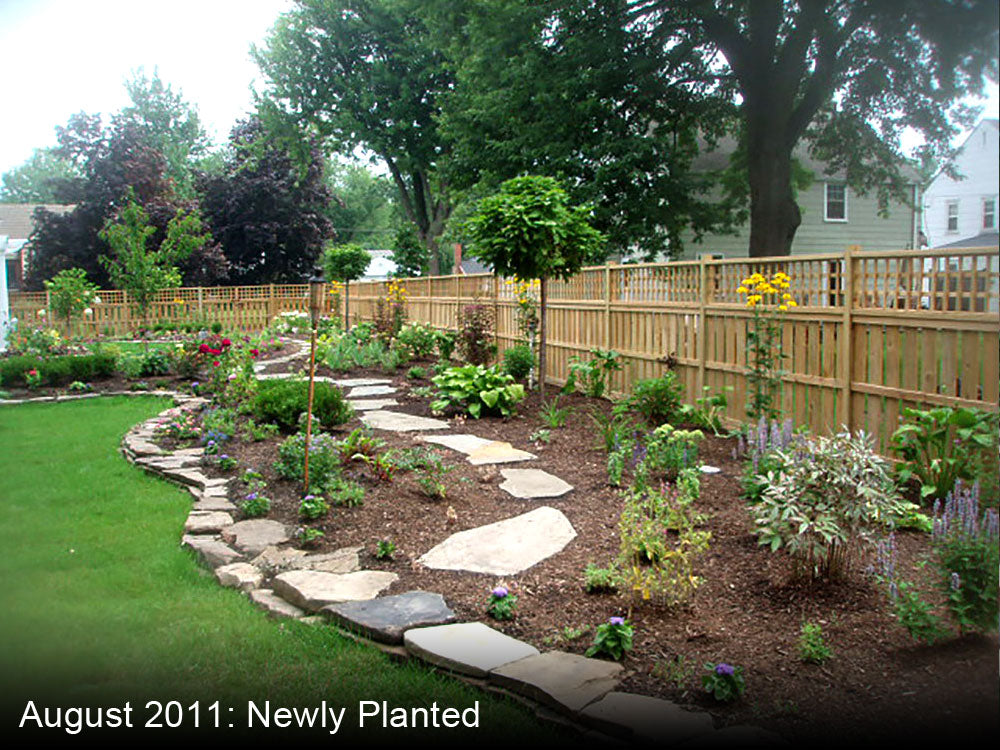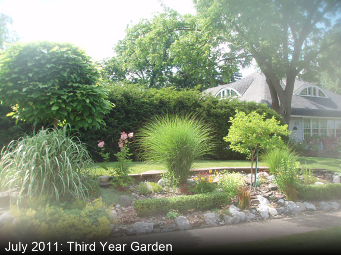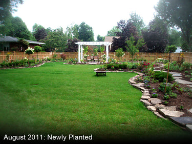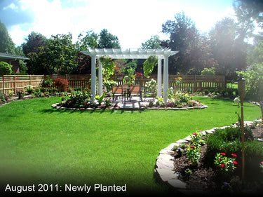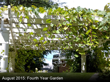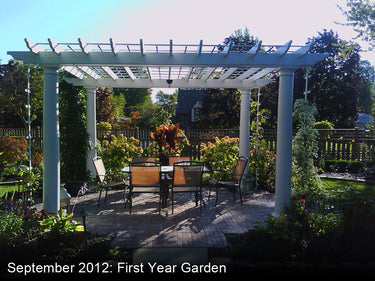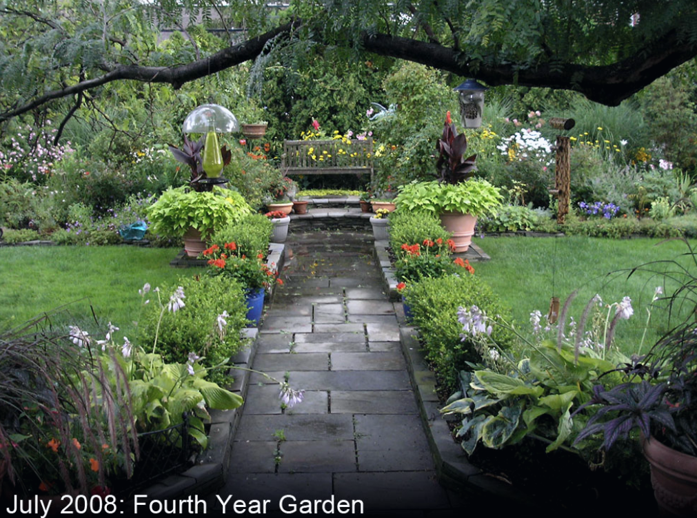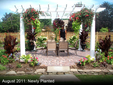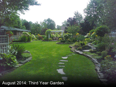 The garden design for this classic English garden began in 2004, with three major phases of construction: the first year saw the introduction of perennial flower beds and privacy plantings, in 2006 we added flagstone walkways and boxwoods, and in 2011 we installed a cedar arbor. The garden includes a sequence of blooms with creeping phlox, viburnum, clematis, and New Dawn rose, tropical red bananas, alocasia, and asters. In 2015 we added a lilac planting; this is a perennial favorite garden!