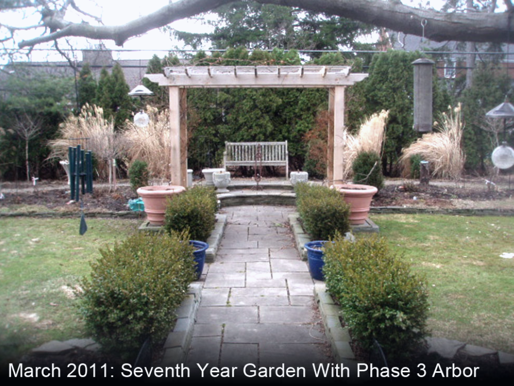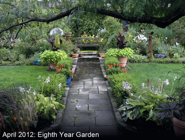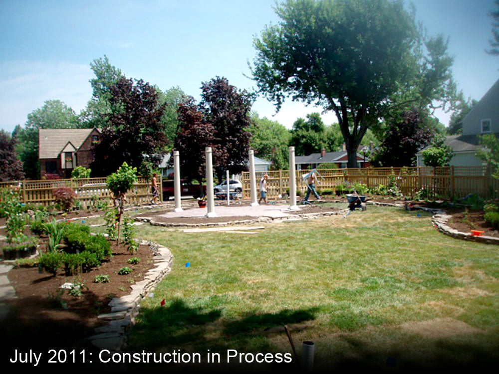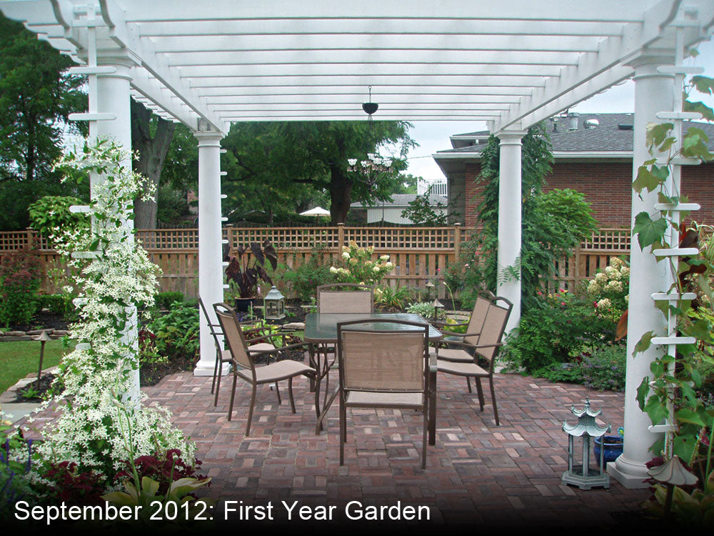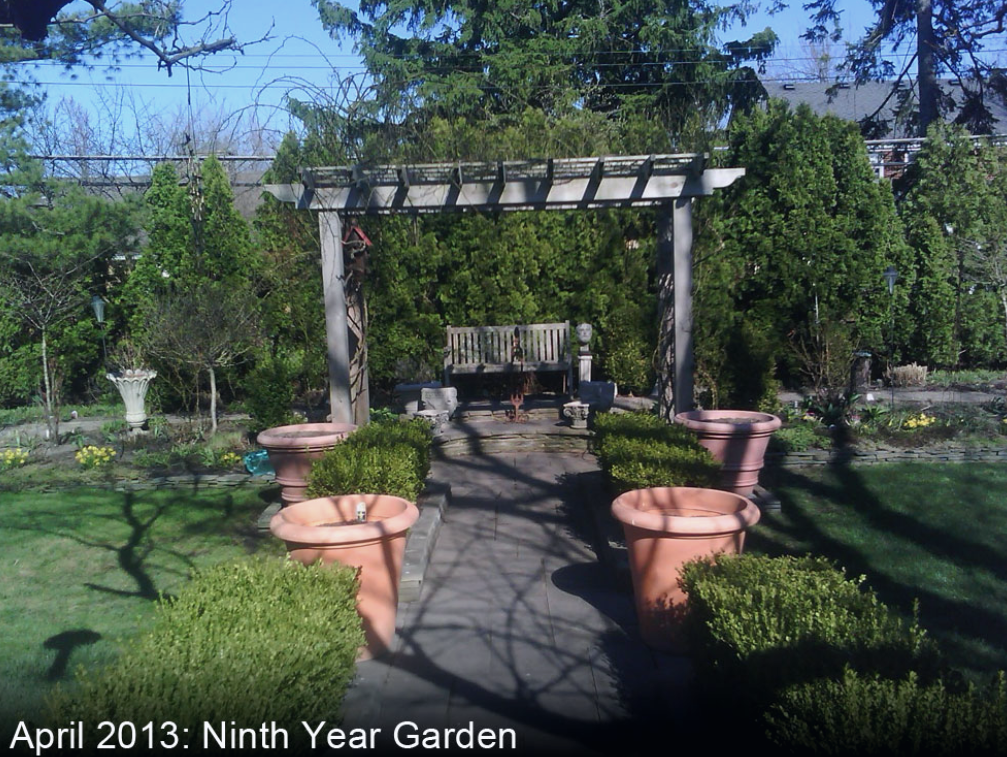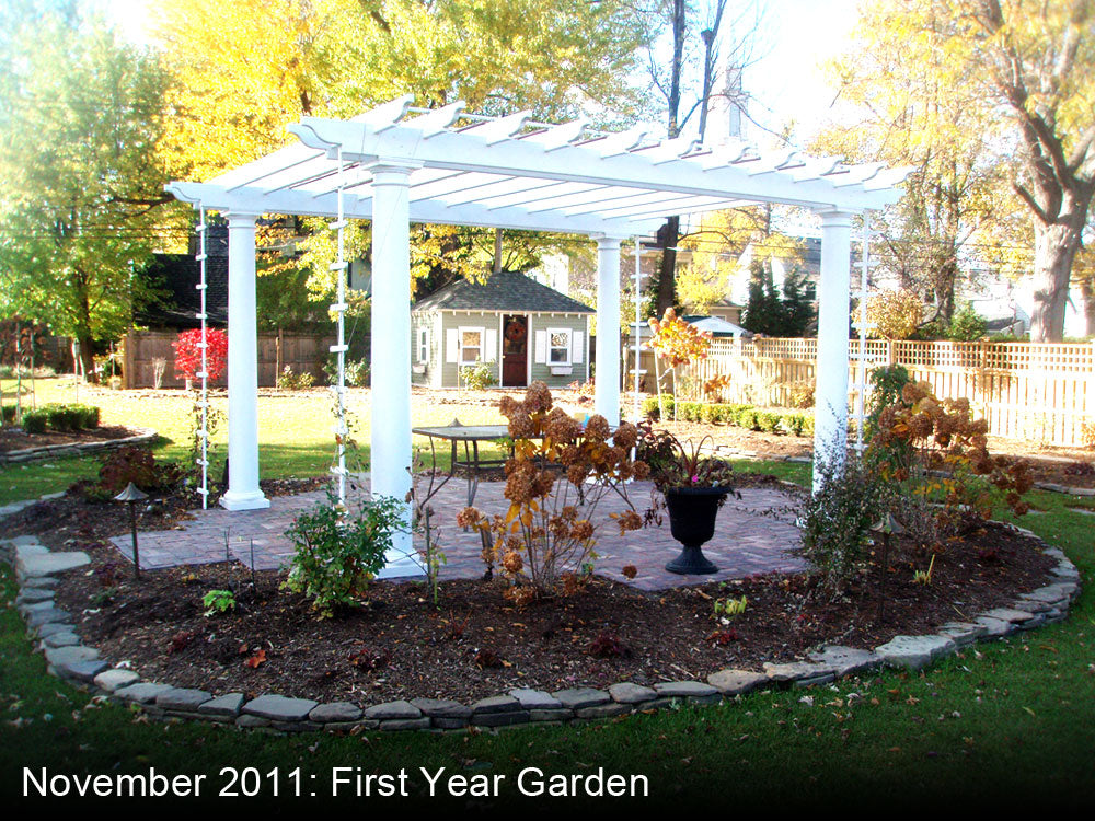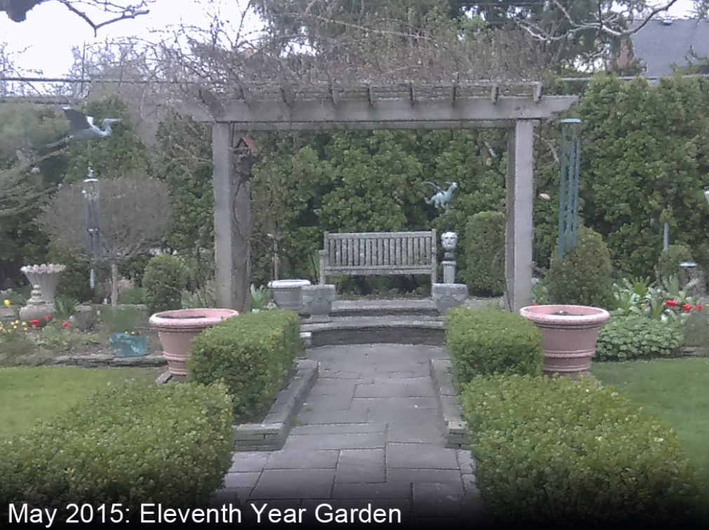 Originally a Victory Garden during World War II, the land was transformed into a beautiful garden, the scale of which is unusual for a private residence. The garden enjoys a sequence of blooms, vertical elements, destinations and focal points from multiple views and low-maintenance design considerations. The hardscape elements include a lattice-top wood fence around the perimeter for climbing vines, a classic brick paver patio under a white pergola with copper accents, a flagstone stepping stone path around the garden, natural stone garden walls and a potting shed. The most recent addition is a geometric raised vegetable garden.