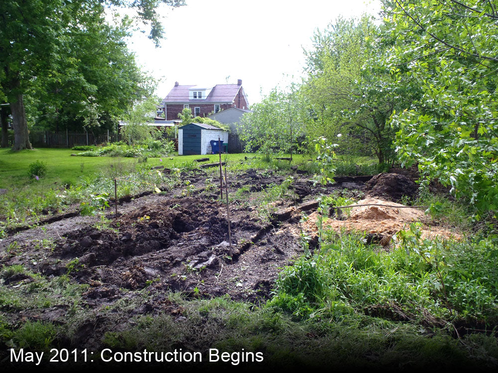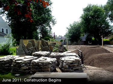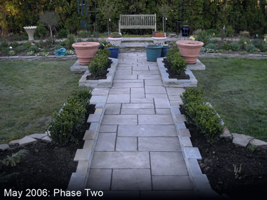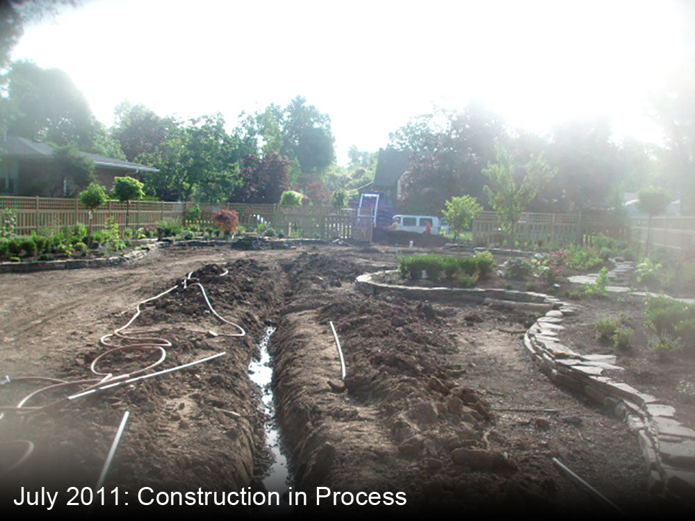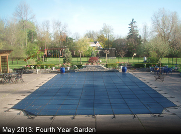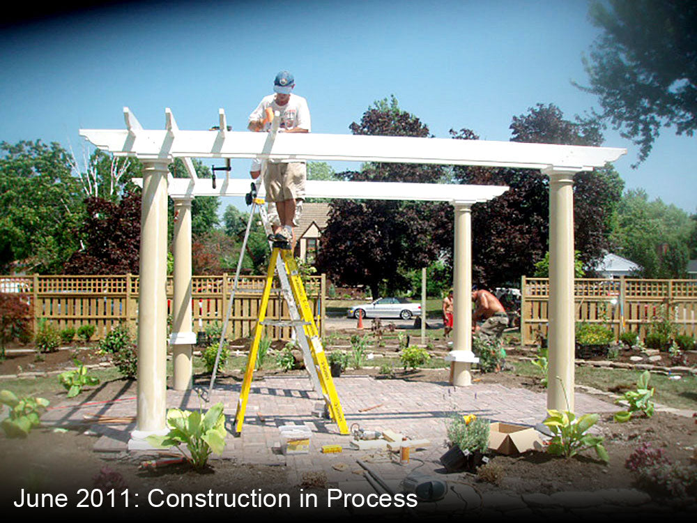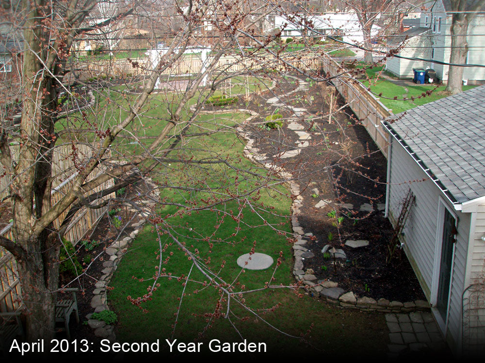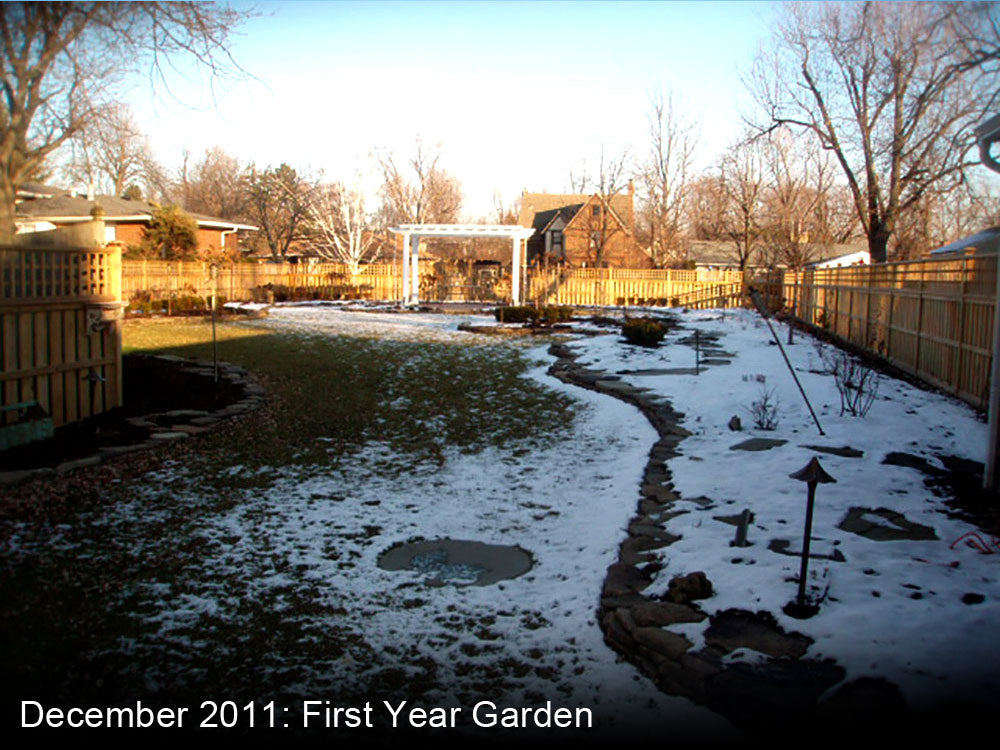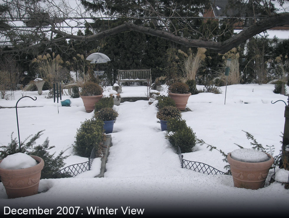 Originally a Victory Garden during World War II, the land was transformed into a beautiful garden, the scale of which is unusual for a private residence. The garden enjoys a sequence of blooms, vertical elements, destinations and focal points from multiple views and low-maintenance design considerations. The hardscape elements include a lattice-top wood fence around the perimeter for climbing vines, a classic brick paver patio under a white pergola with copper accents, a flagstone stepping stone path around the garden, natural stone garden walls and a potting shed. The most recent addition is a geometric raised vegetable garden.