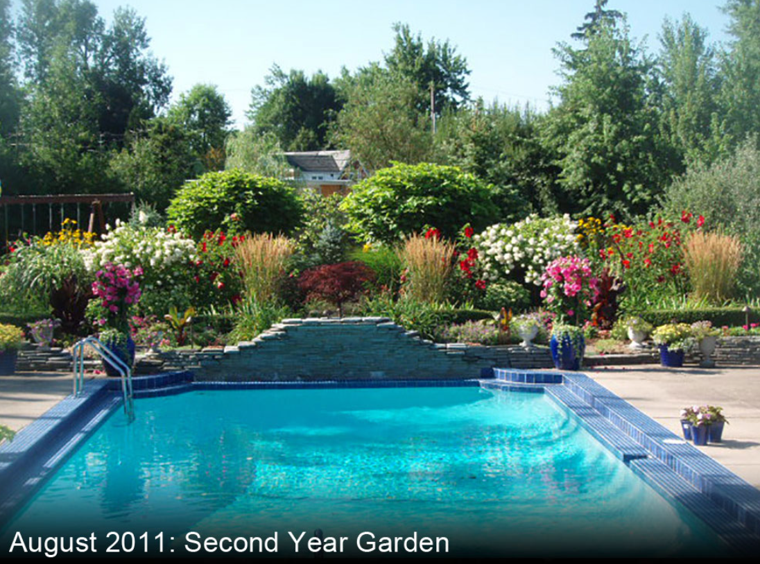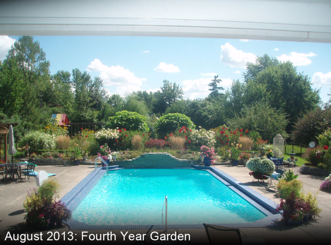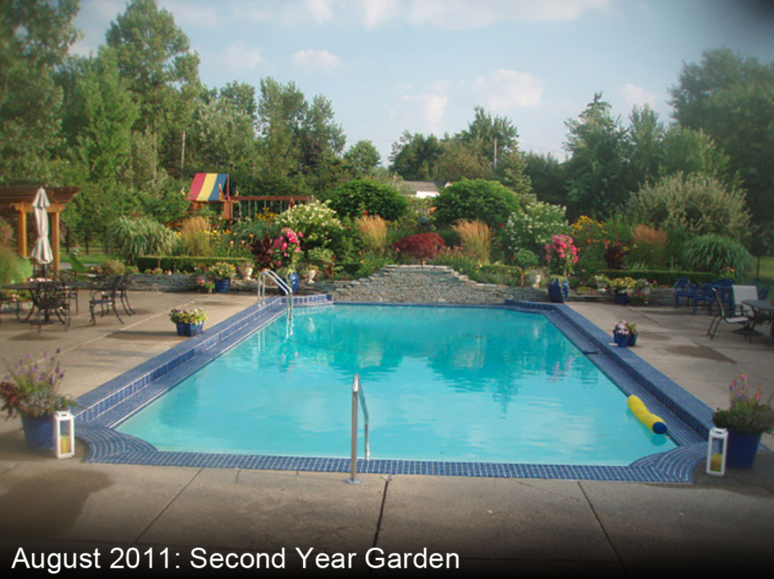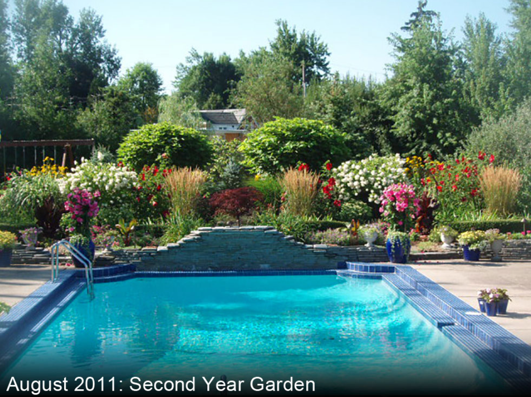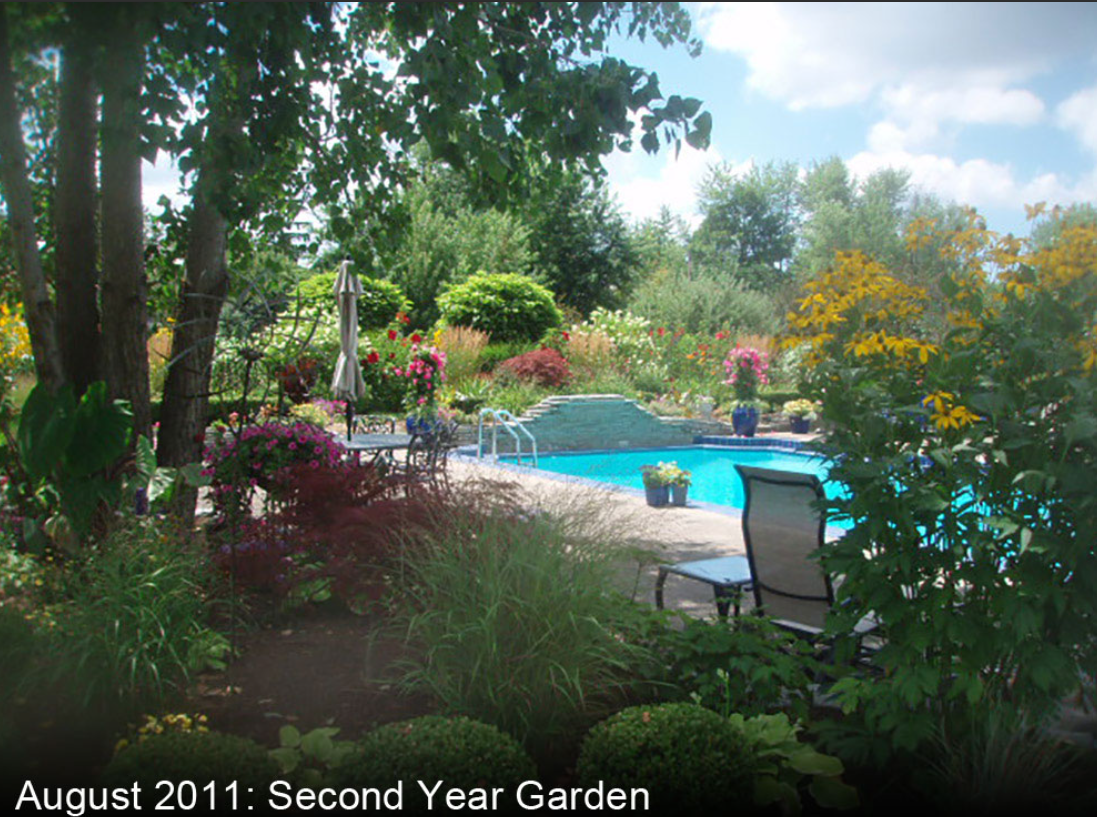 The front garden of this residence shows off every season with strong bones and wave after wave of color, but we’re featuring the back gardens where the owners relax. It has a pool and hot tub for grandchildren to enjoy as well as trampoline and playset. The sequence of blooms, and a climax in early August, correspond to the wedding ceremony that was hosted here on a beautiful night with amazing dining, flowers and ambiance with night lighting for 200 guests…it was a memorable night!