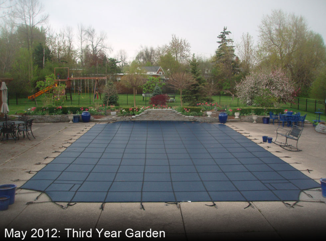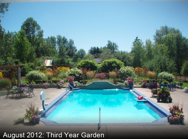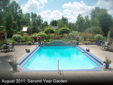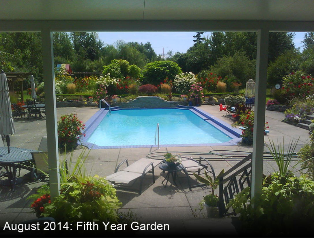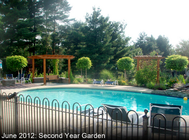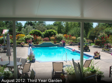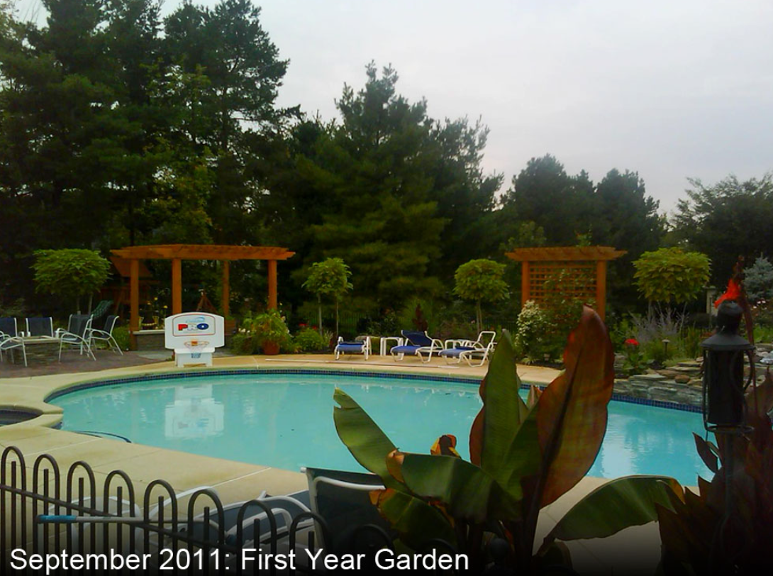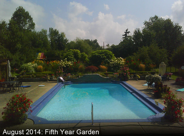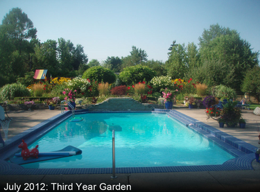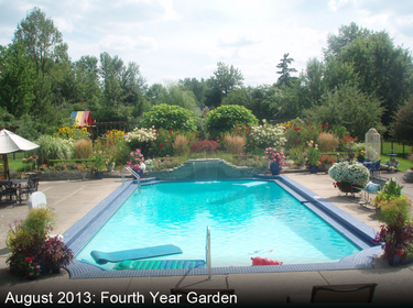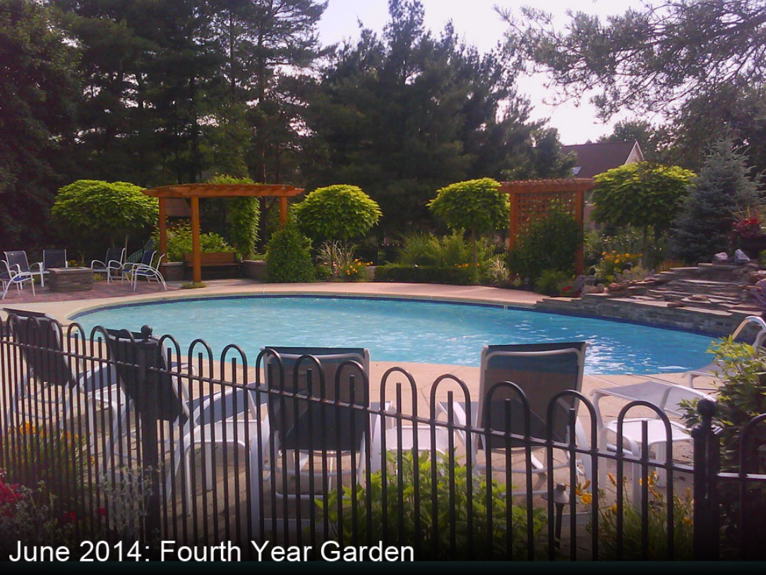 The front garden of this residence shows off every season with strong bones and wave after wave of color, but we’re featuring the back gardens where the owners relax. It has a pool and hot tub for grandchildren to enjoy as well as trampoline and playset. The sequence of blooms, and a climax in early August, correspond to the wedding ceremony that was hosted here on a beautiful night with amazing dining, flowers and ambiance with night lighting for 200 guests…it was a memorable night!