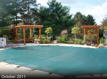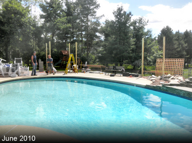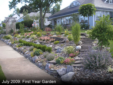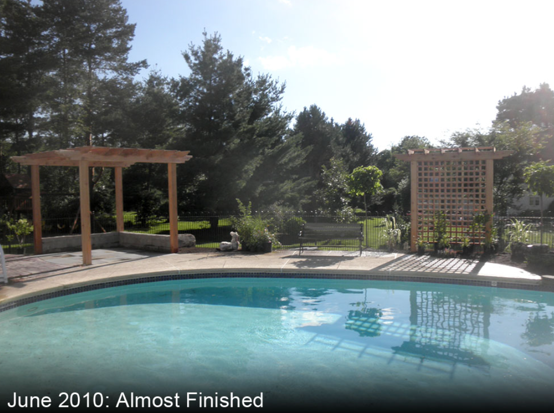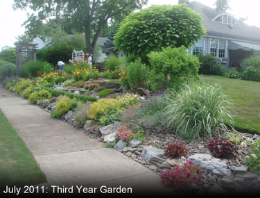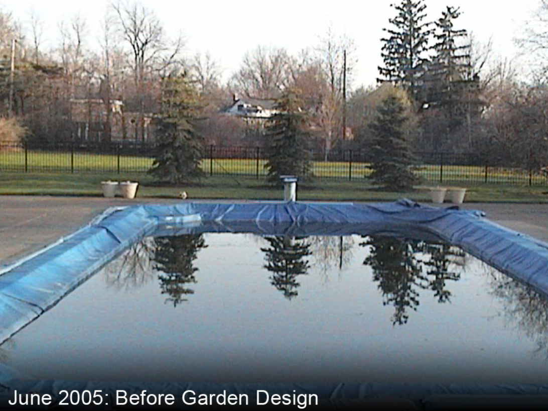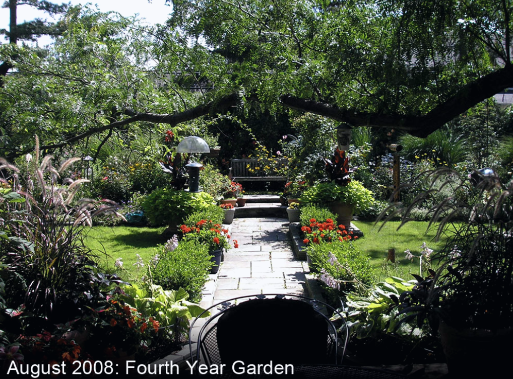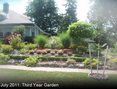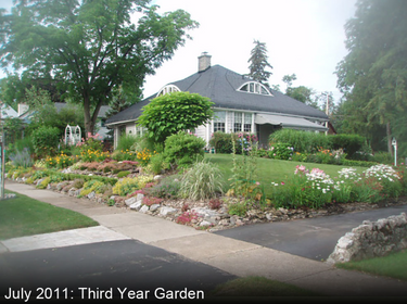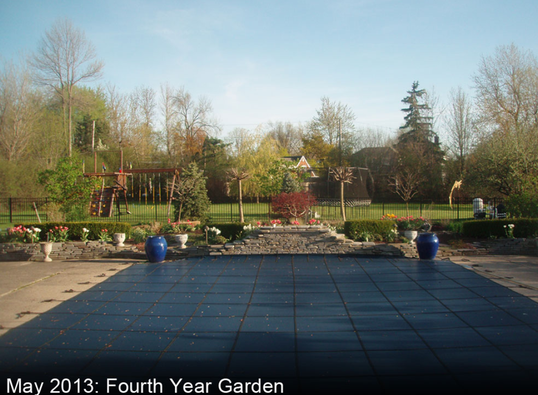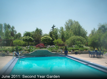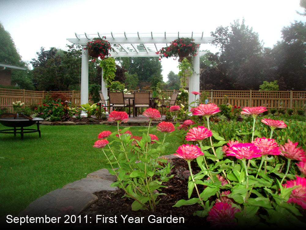The front garden of this residence shows off every season with strong bones and wave after wave of color, but we’re featuring the back gardens where the owners relax. It has a pool and hot tub for grandchildren to enjoy as well as trampoline and playset. The sequence of blooms, and a climax in early August, correspond to the wedding ceremony that was hosted here on a beautiful night with amazing dining, flowers and ambiance with night lighting for 200 guests…it was a memorable night!