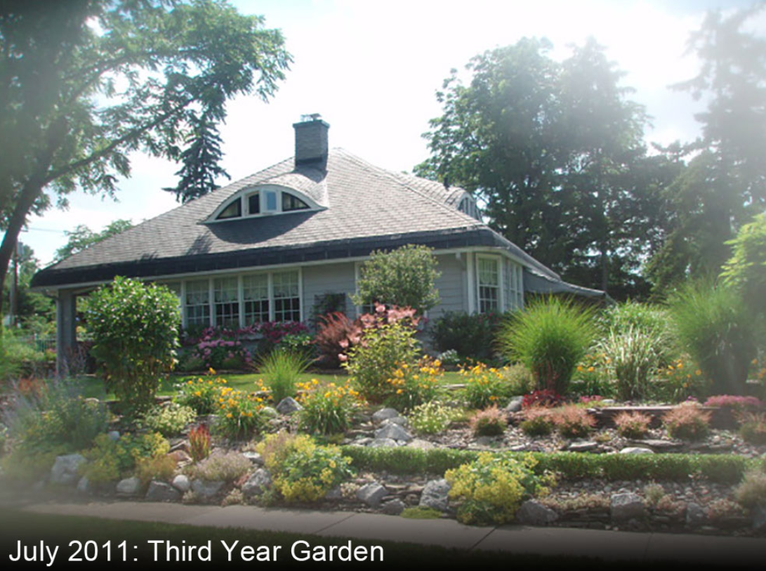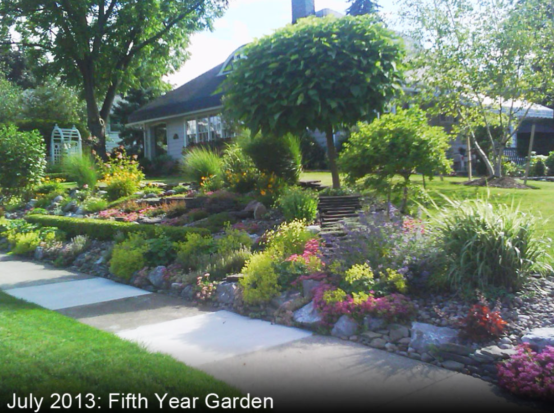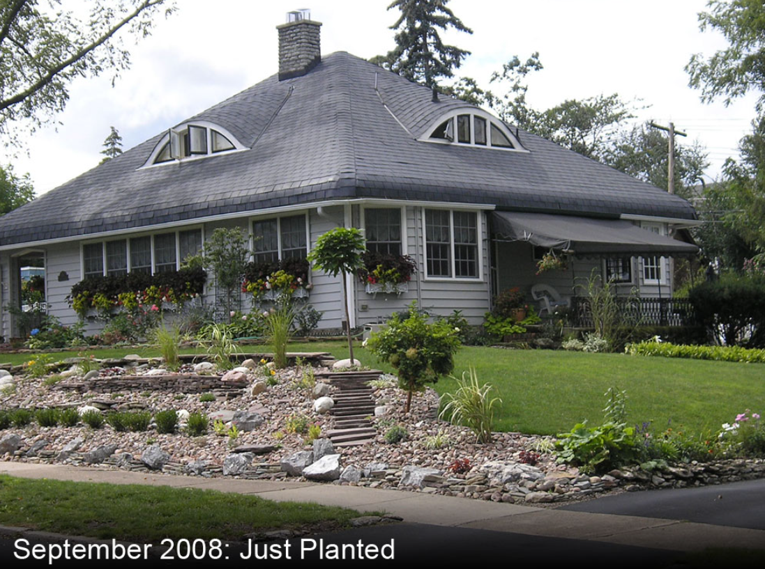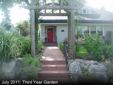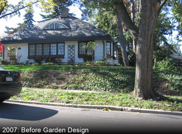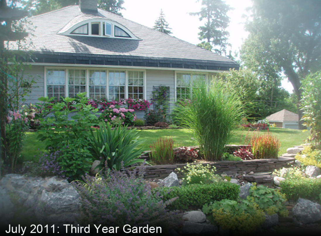 Beginning in 2007, a design evolved, resulting in hazardous trees removed and a front garden transformation. The design complemented the home’s architecture with flagstone echoing the unusual roof style, and an arbor that mimics the eyebrow windows. Phase two included creating new patios, and then six years after beginning the transformation, a White Garden was planted on the side slope which has matured nicely.