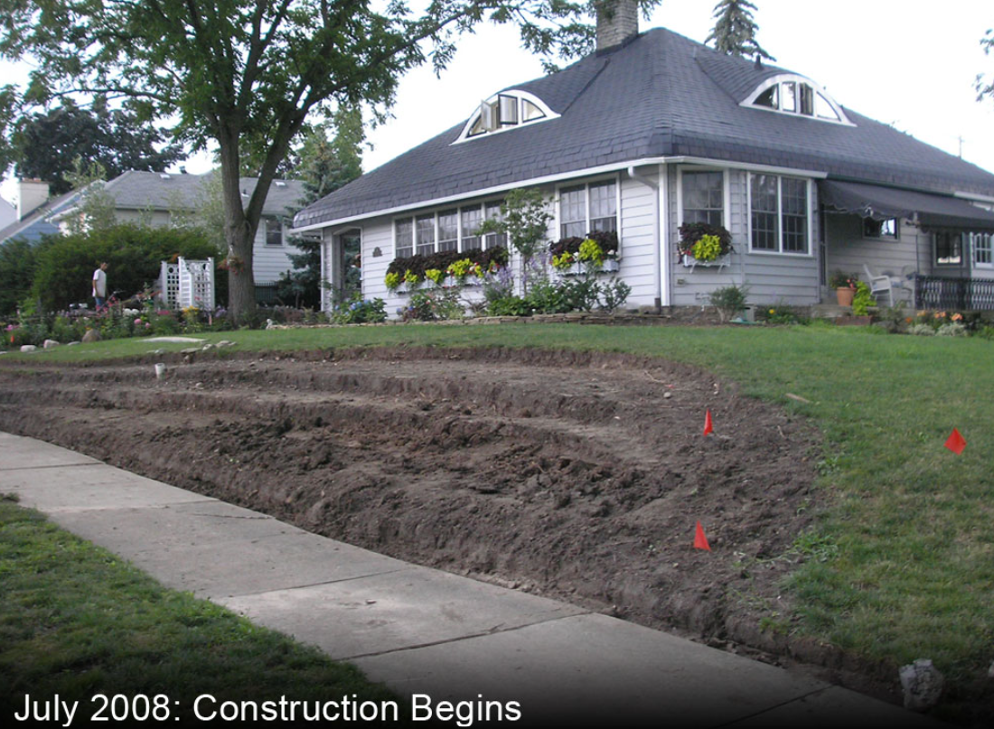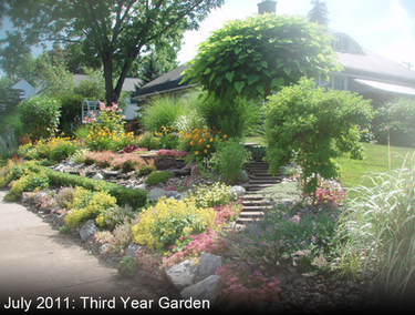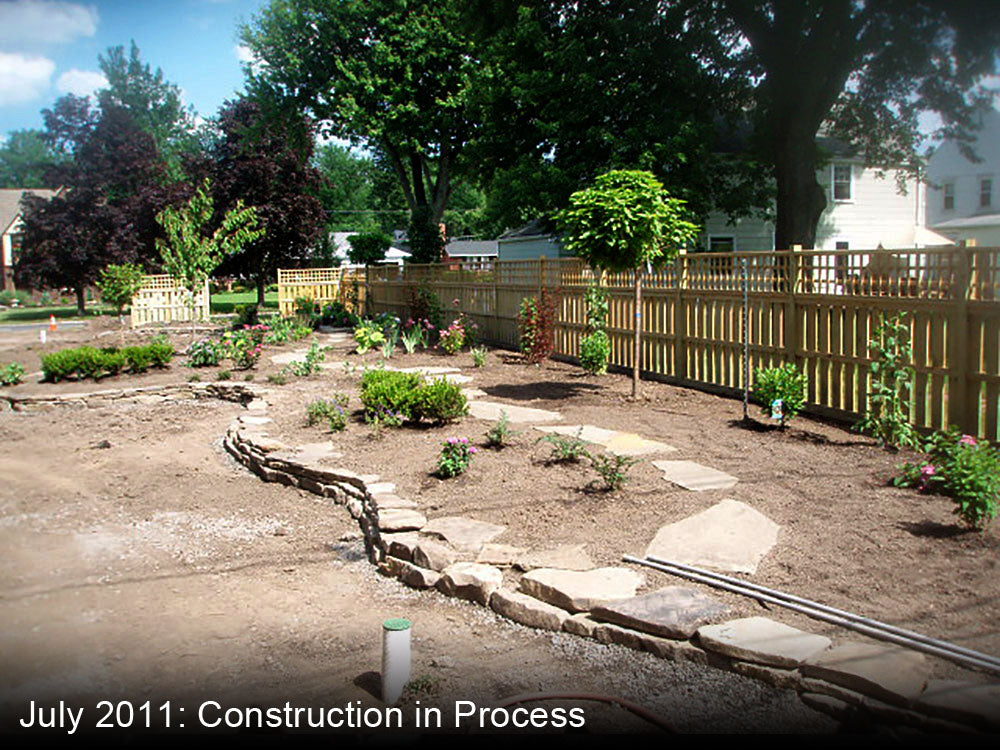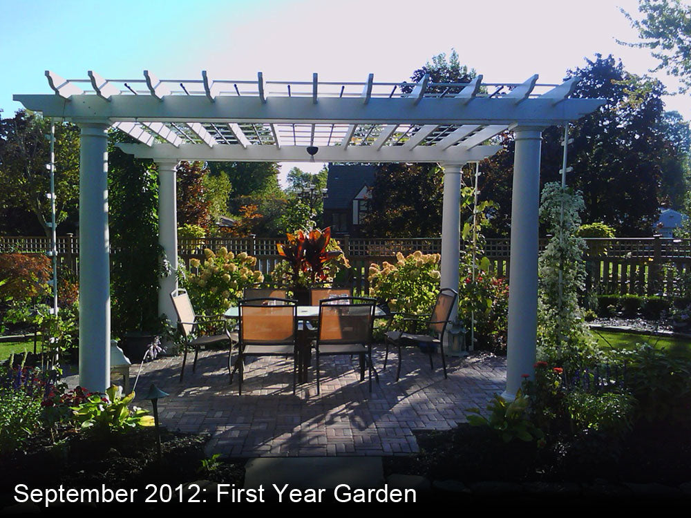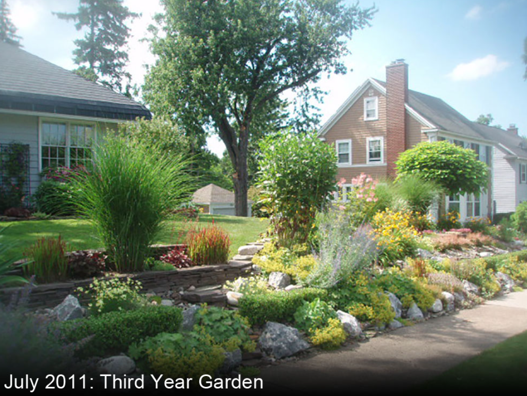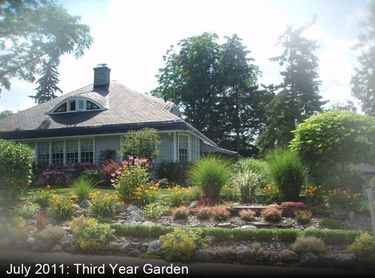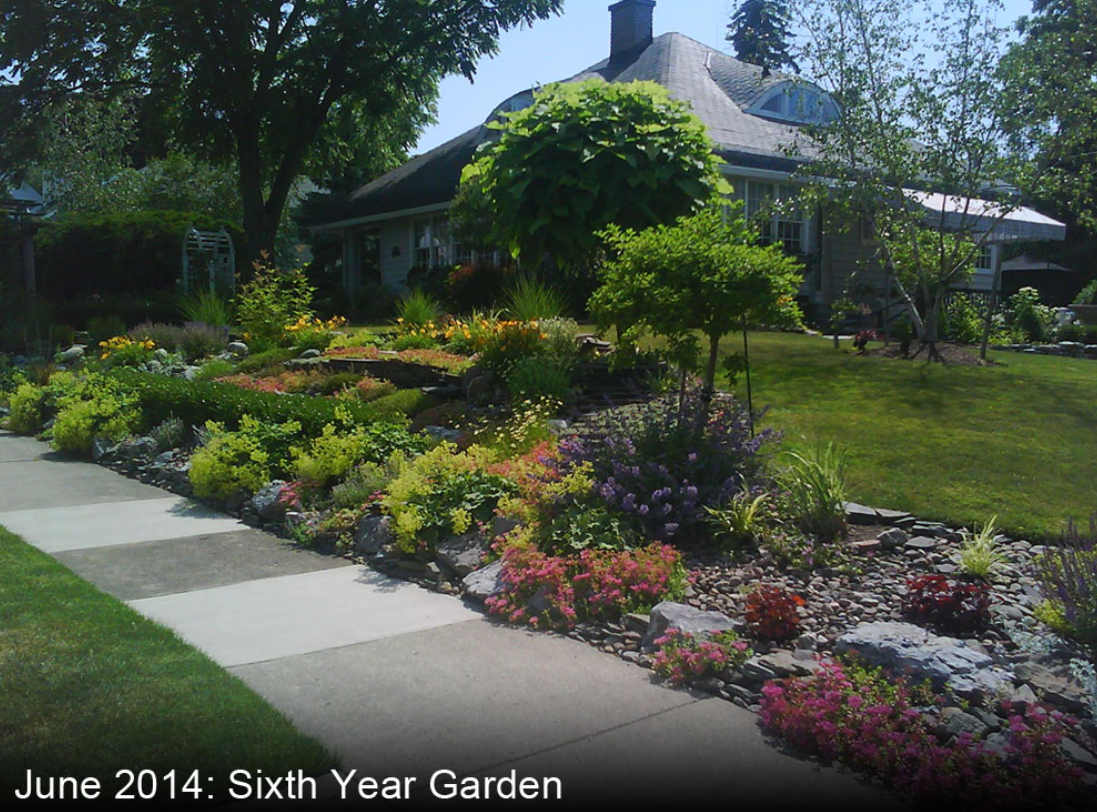 Beginning in 2007, a design evolved, resulting in hazardous trees removed and a front garden transformation. The design complemented the home’s architecture with flagstone echoing the unusual roof style, and an arbor that mimics the eyebrow windows. Phase two included creating new patios, and then six years after beginning the transformation, a White Garden was planted on the side slope which has matured nicely.